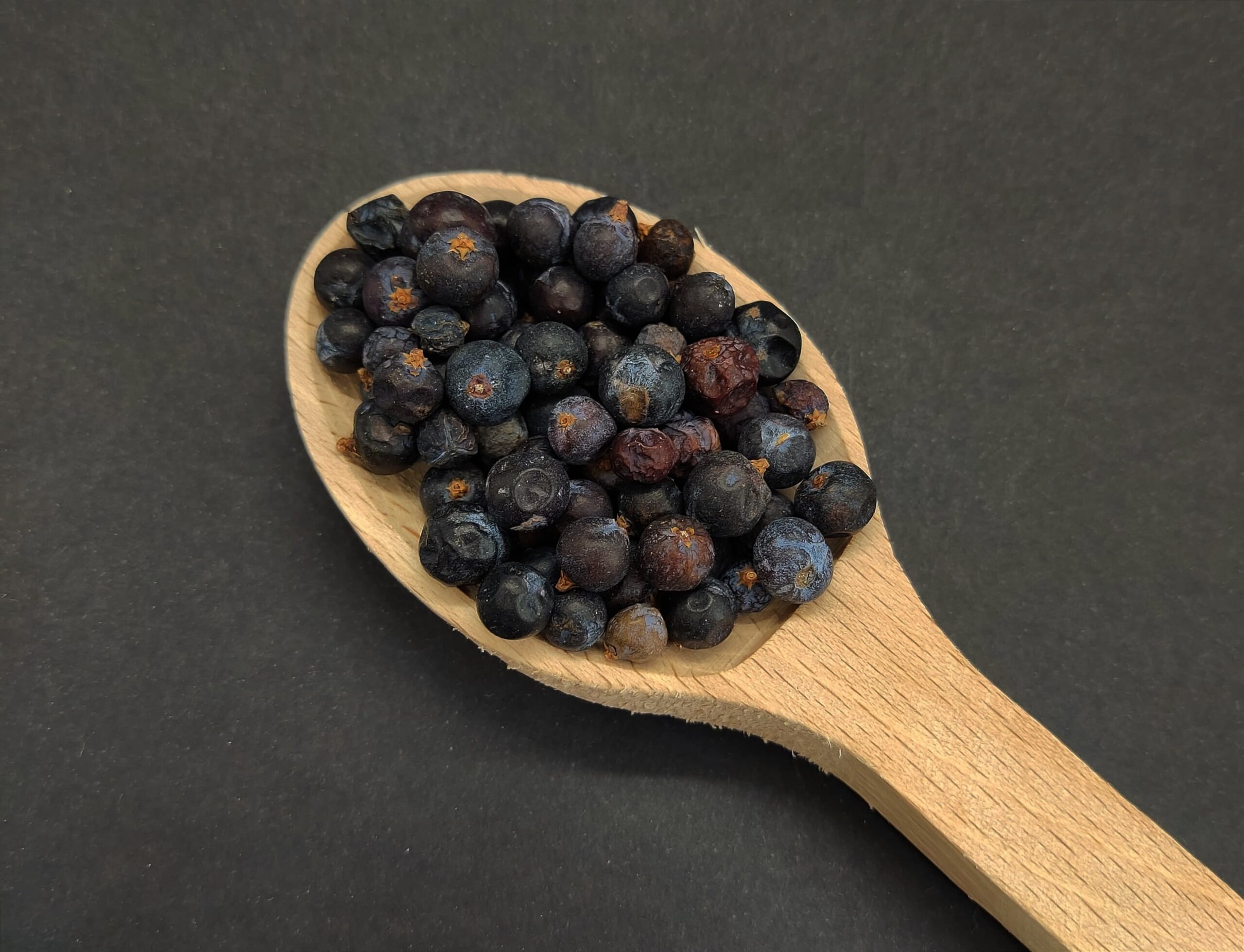 Jałowiec ziarno– Kulki zbierane z drzew jałowca o ciemnym zabarwieniu i słodko-gorzkim zapachu.